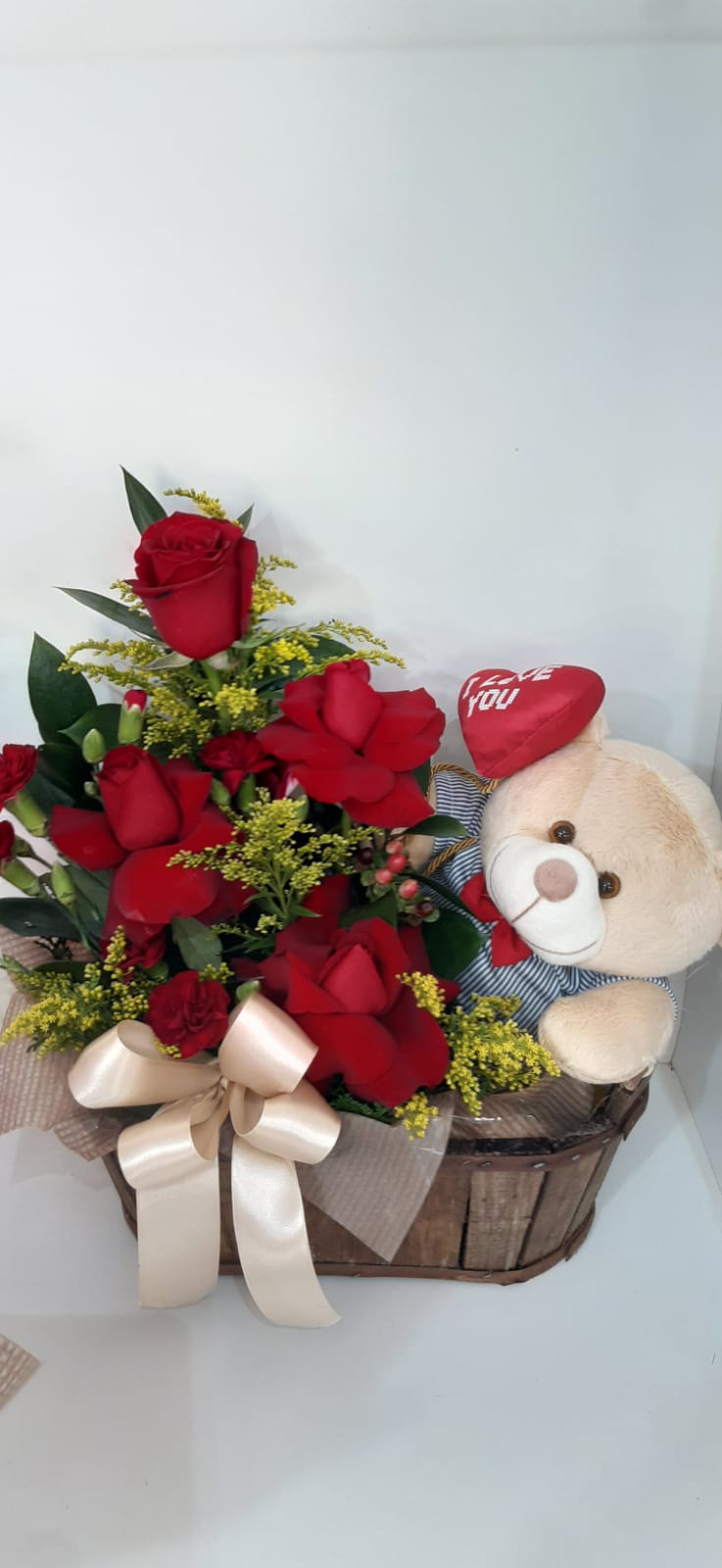 caixa de madeira rustica com lindo arranjo de 4 rosas e urso