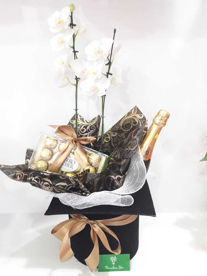 VASO ORQUIDEA, NUMA LINDA CAIXA FORMATO CARTOLA PRETA ,CHAMPAGNE E FERRERO ROCHER