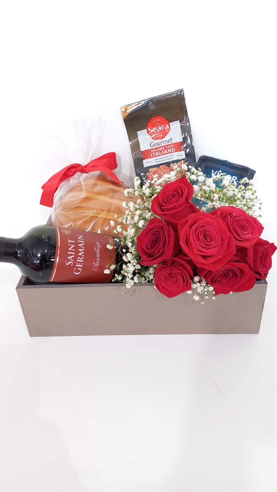 CAIXA BUQUÊ DE ROSAS IMPORTADAS VINHO QUEIJO PÃO SALAME.