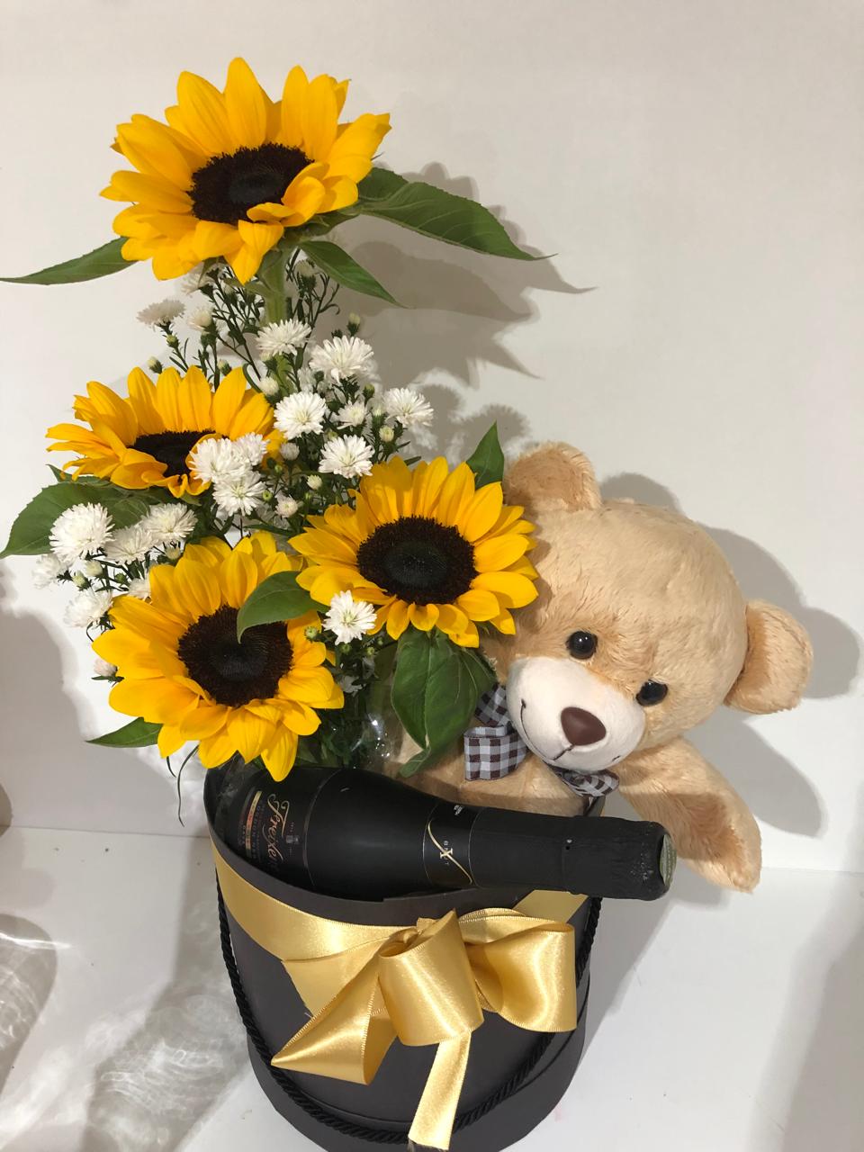CAIXA COM URSO CHAMPAGNE GIRASSOIS