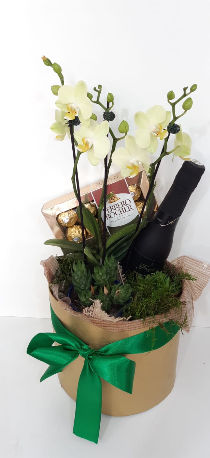CAIXA COM SUCULENTA ORQUIDEA PT 09 E FERRERO ROCHER e champagne flexenet 200ml