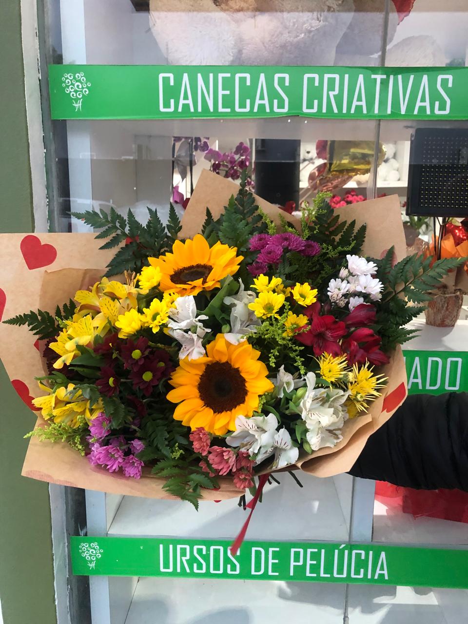 Um verdadeiro festival de cores e sentimentos! Este buquê reúne girassóis radiantes, alstroemérias, crisântemos, margaridinhas, flores do campo e folhagens selecionadas, formando uma composição alegre e cheia de vida. Ideal para celebrar aniversários, parabenizar alguém especial ou simplesmente iluminar o dia de quem você ama. Um presente que transmite carinho, energia positiva e muito afeto!
