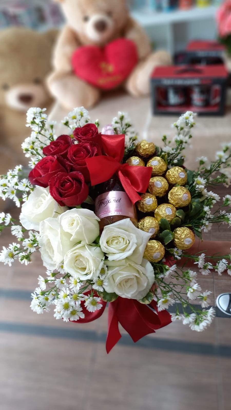 Caixa com 12 rosas, 12 bombons ferrero rocher e champagne freixenet