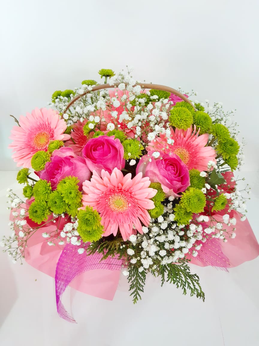 CESTA DE VIME COM 5 EROSAS E 3 GERBERAS E ACABAMENTOS CEDRO PINOQUIO GIPSOFILA.