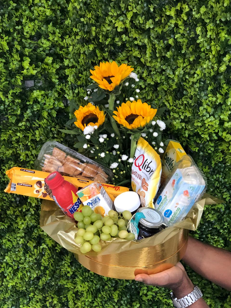 ARRANJO DE FLOR FRUTA SUCO QUEIJO CROSSAM GELEIA NUTELLA BISCOITO BEL VITA COOKIES