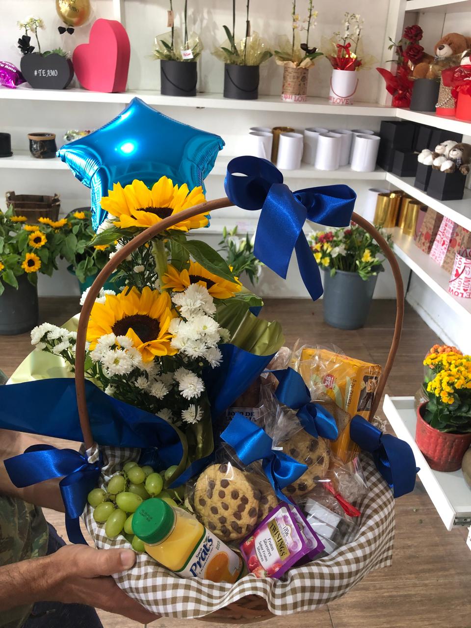 ARRANJO DE 3 GIRASSOIS BOLO, TORRADAS, COOKIES,SUCO, CAFÉ, FRUTA UVA, QUEIJO, GELEIAS,CHÁ CROASSAM.